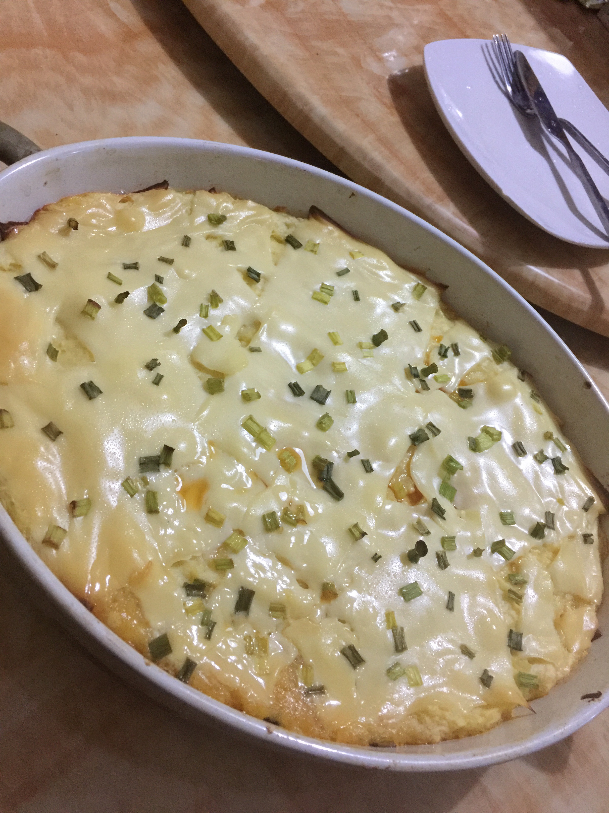 Put minced meat, spices and peas&carrot in a skillet. Stir fry. Add in some water and cook for about 5mins. Transfer to a baking dish. Flatten and make a layer of the mash. Then top with cheese (either sliced or grated. Chedder would go too) garnish with diced scallions and bake for about 30mins on low heat. ( Till cheese is completely melted).