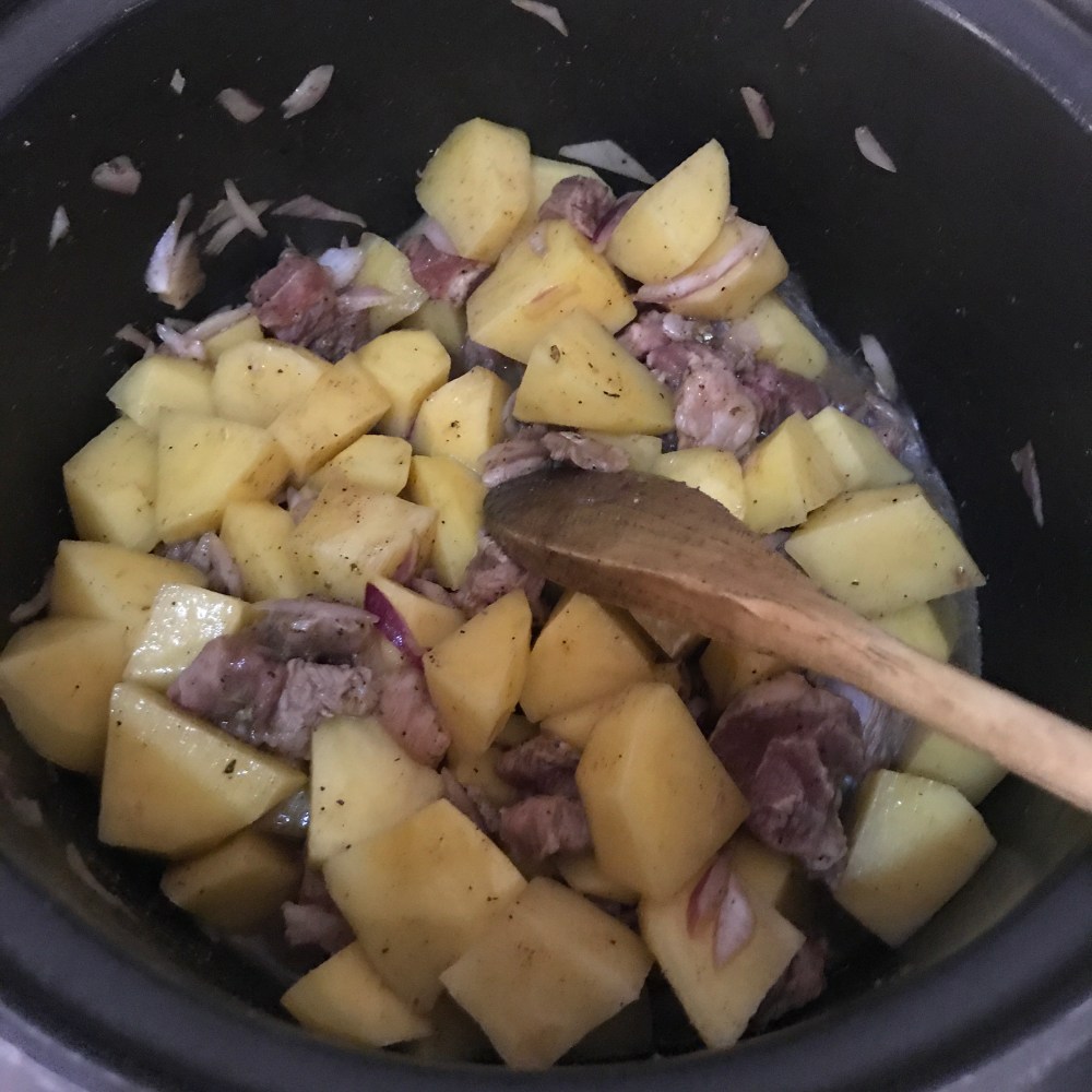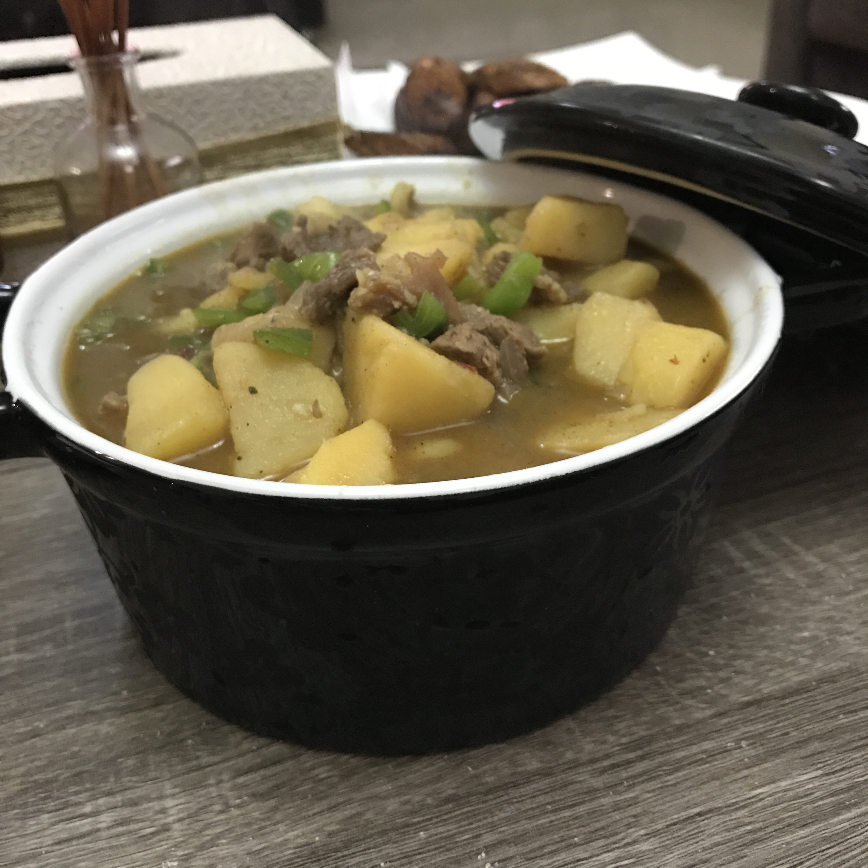 Add water and let cook till potatoes are tender. Add in diced green peppers and serve hot.