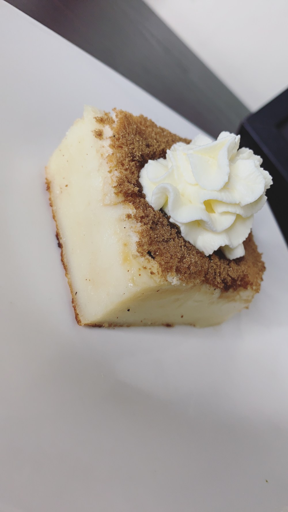 Cool the cake completely before dusting with powdered brown sugar. Even cooled, it will be slightly jiggly because it has custard layer in the center!
