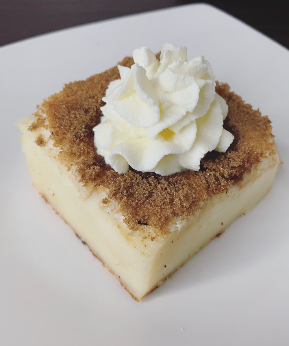 Cool the cake completely before dusting with powdered brown sugar. Even cooled, it will be slightly jiggly because it has custard layer in the center!