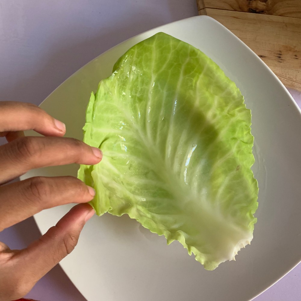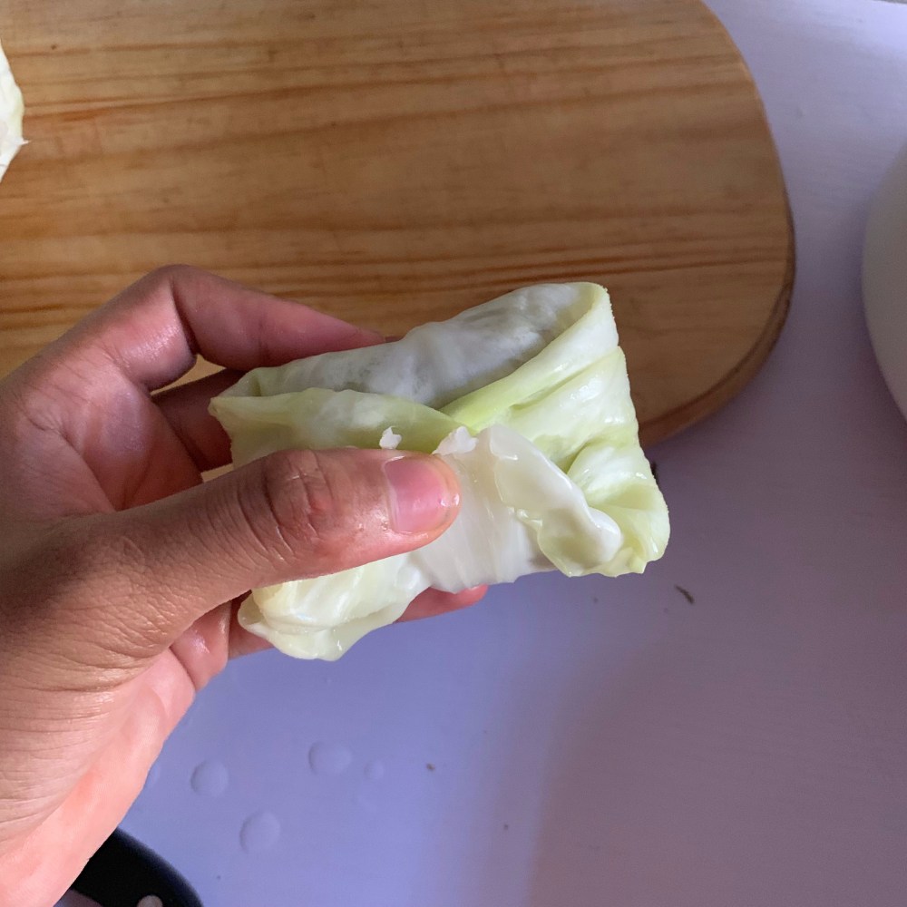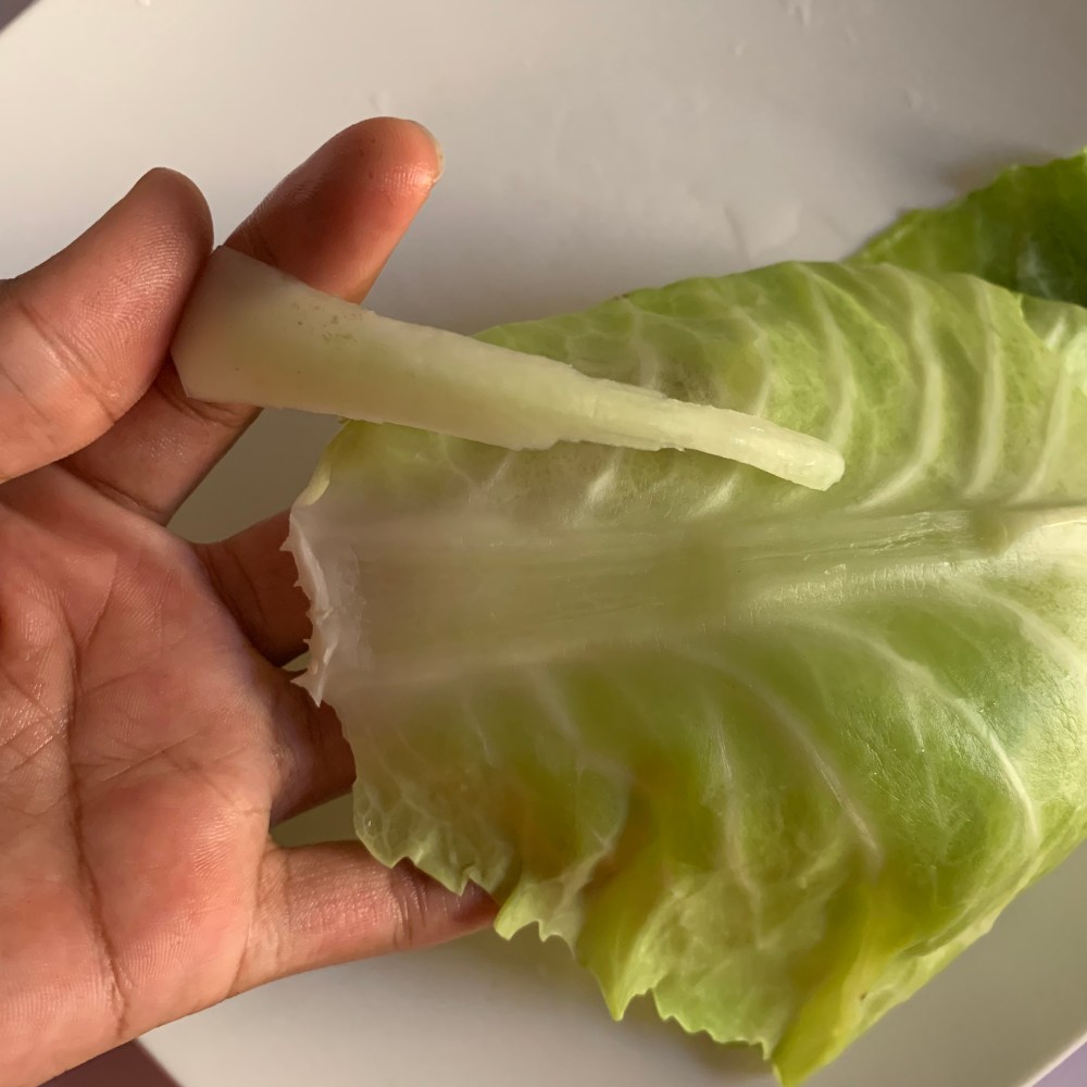Boil the cabbage for about 5minutes. Take it out and let it rest for another 5mins then peel off the leaves gently and keep aside. Trim the root of the leaves (I don’t know what they’re called).