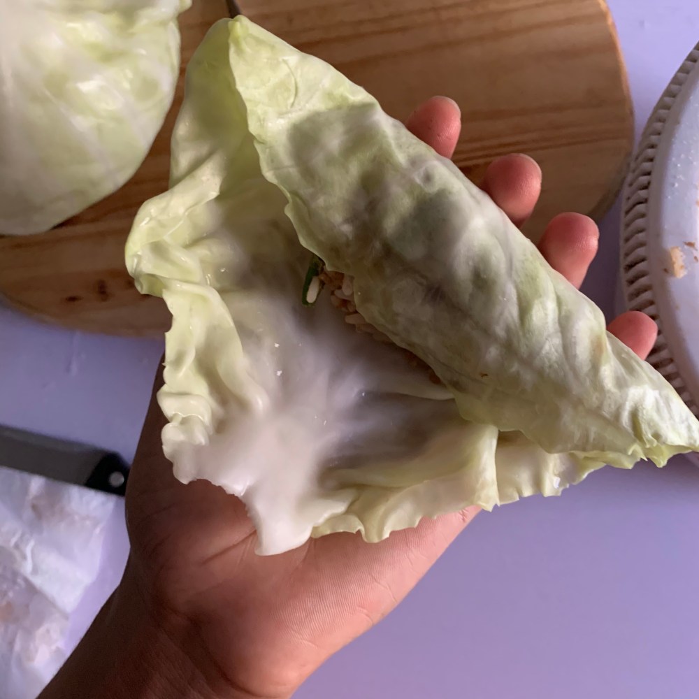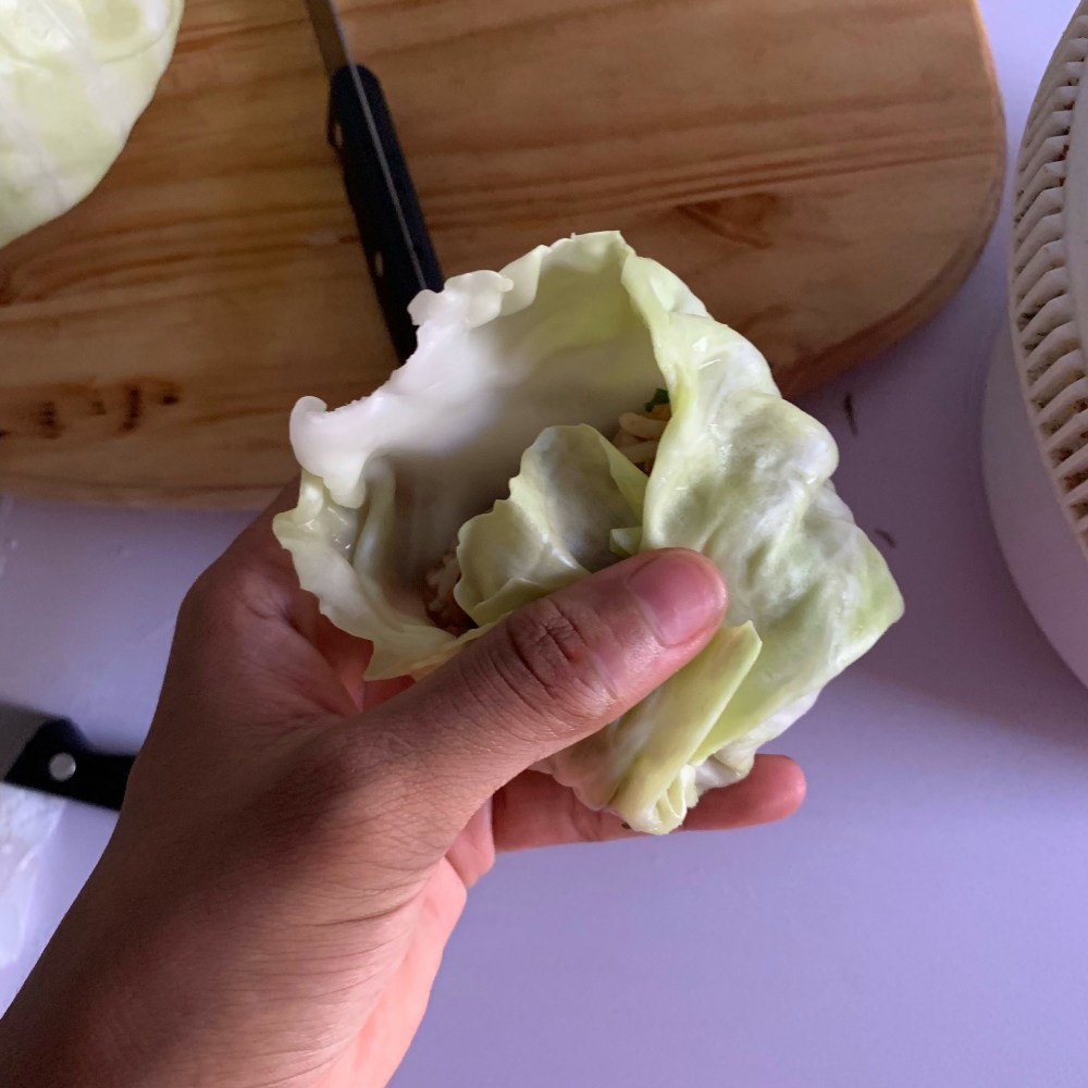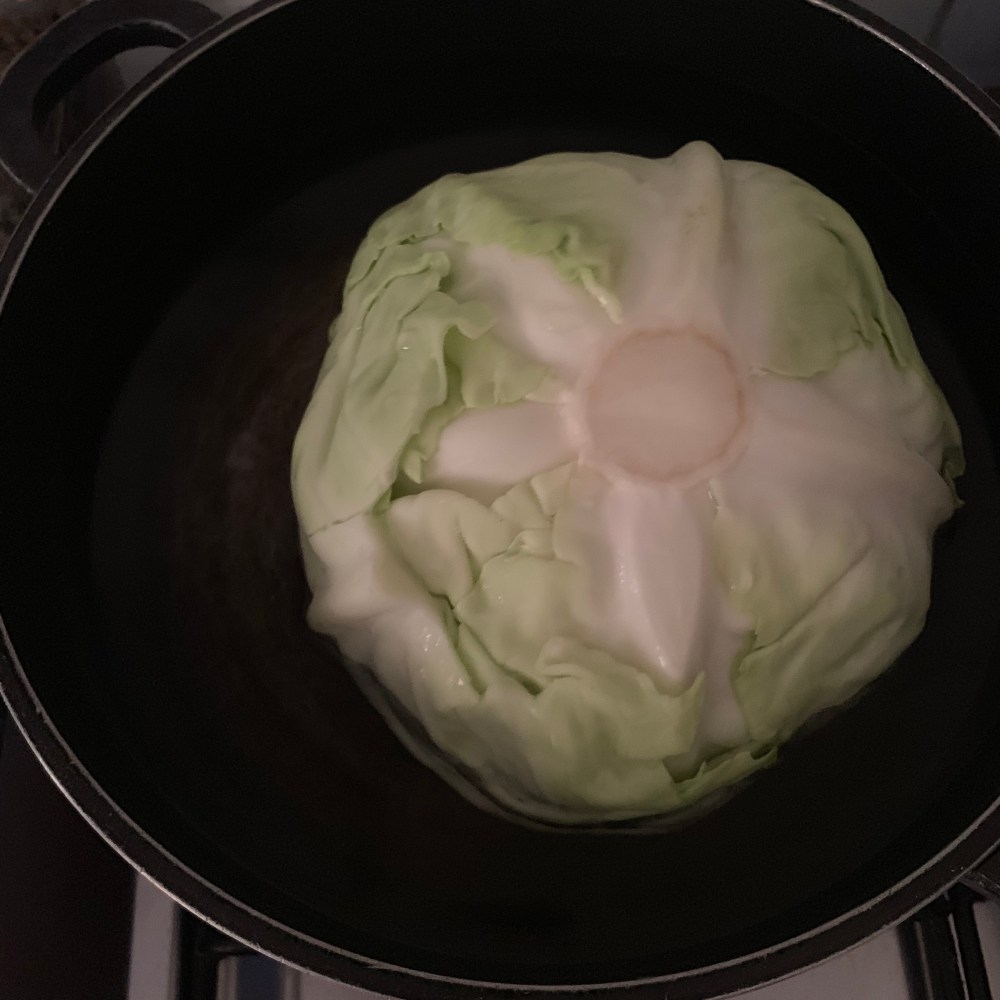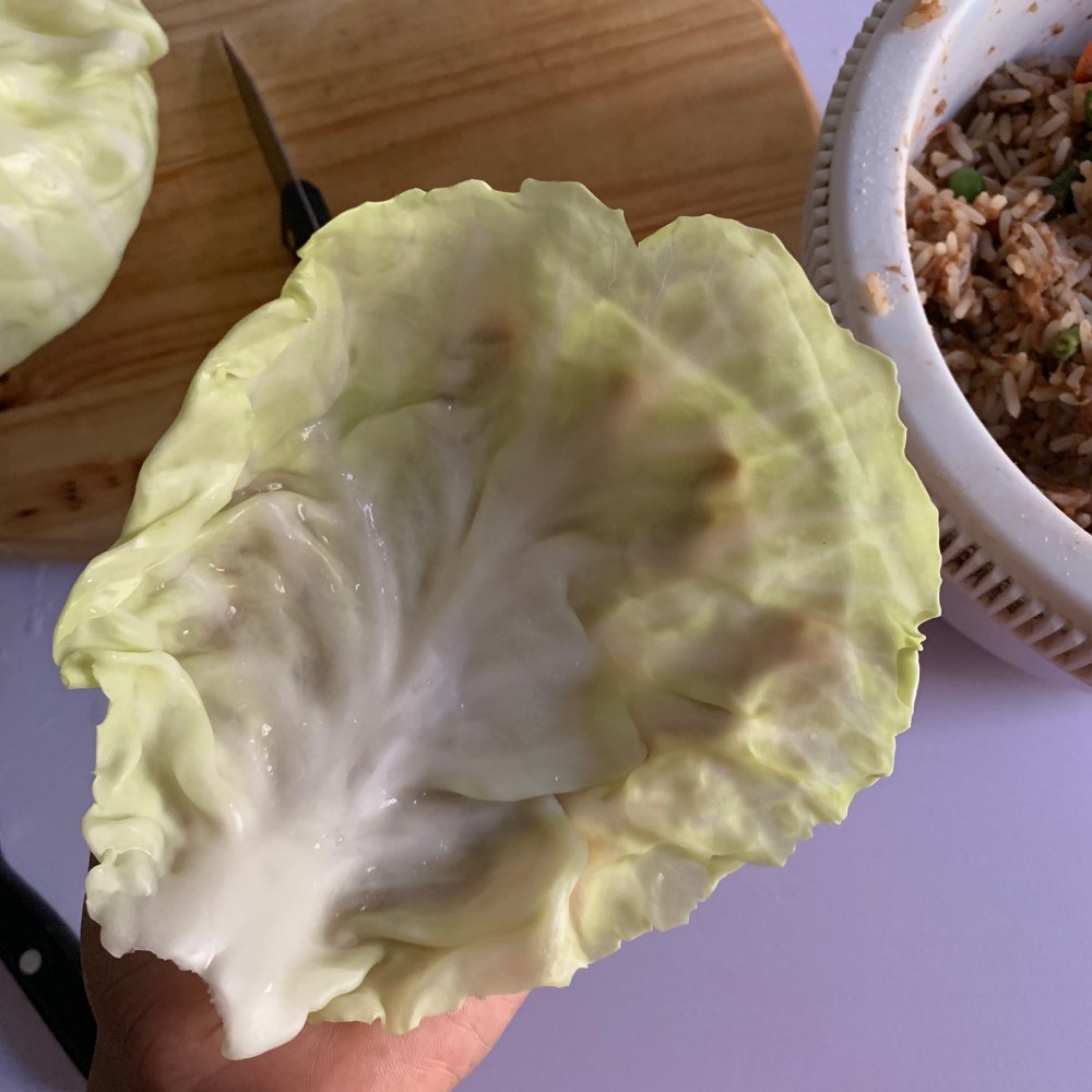 Boil the cabbage for about 5minutes. Take it out and let it rest for another 5mins then peel off the leaves gently and keep aside. Trim the root of the leaves (I don’t know what they’re called).