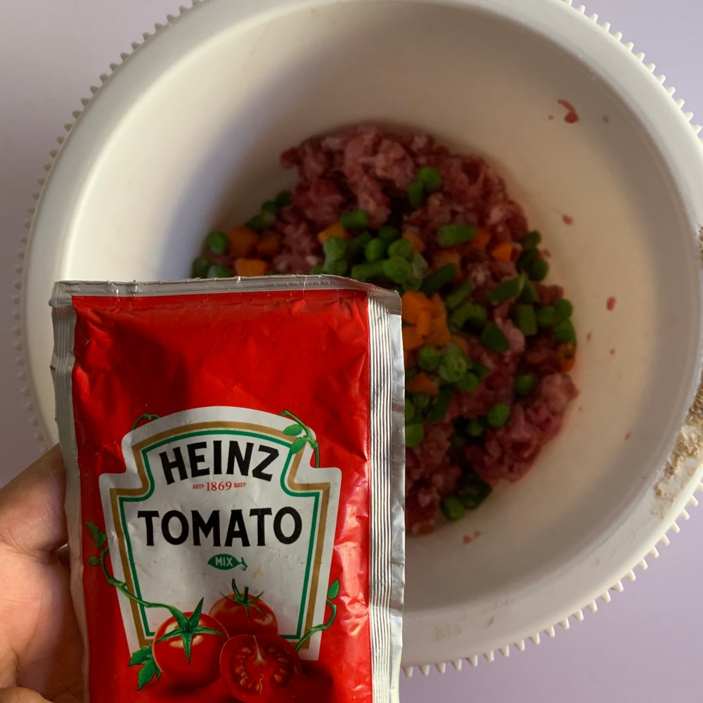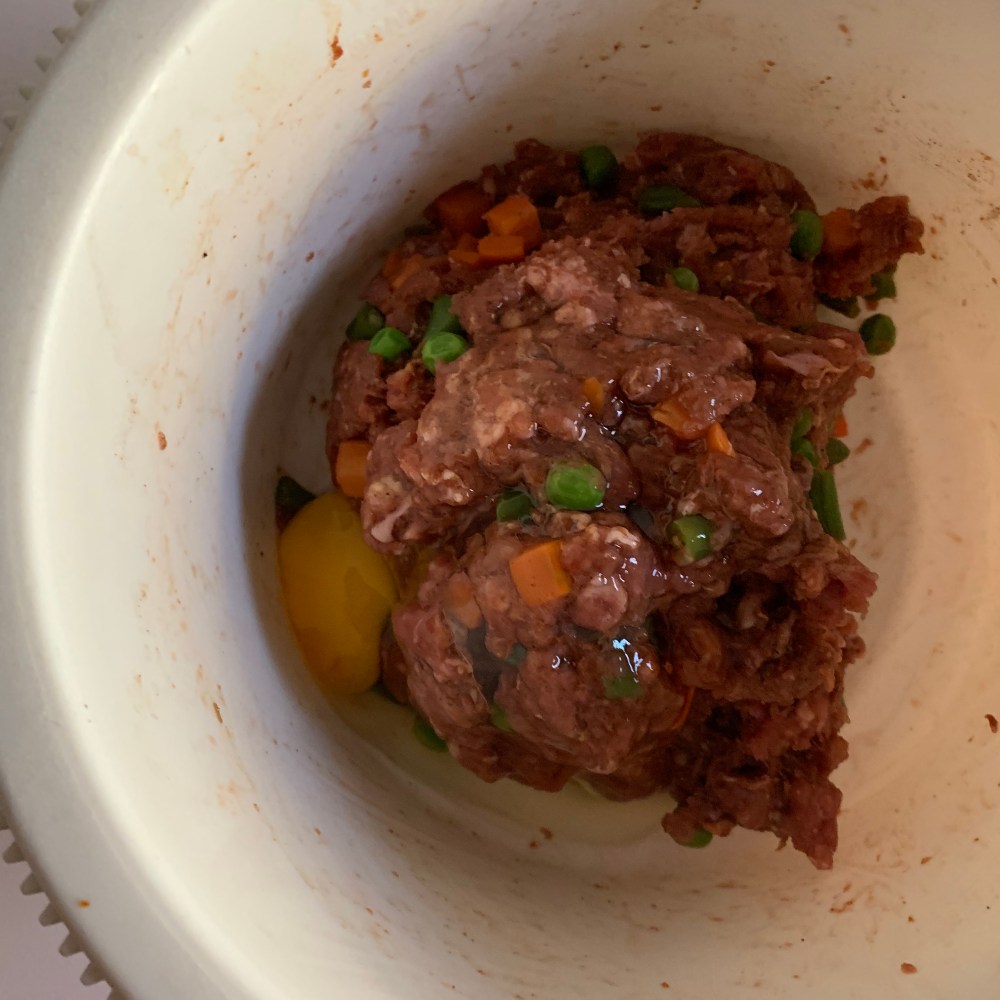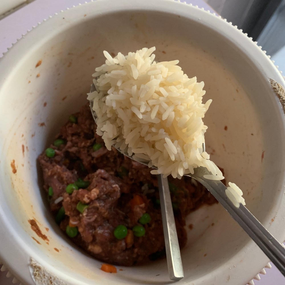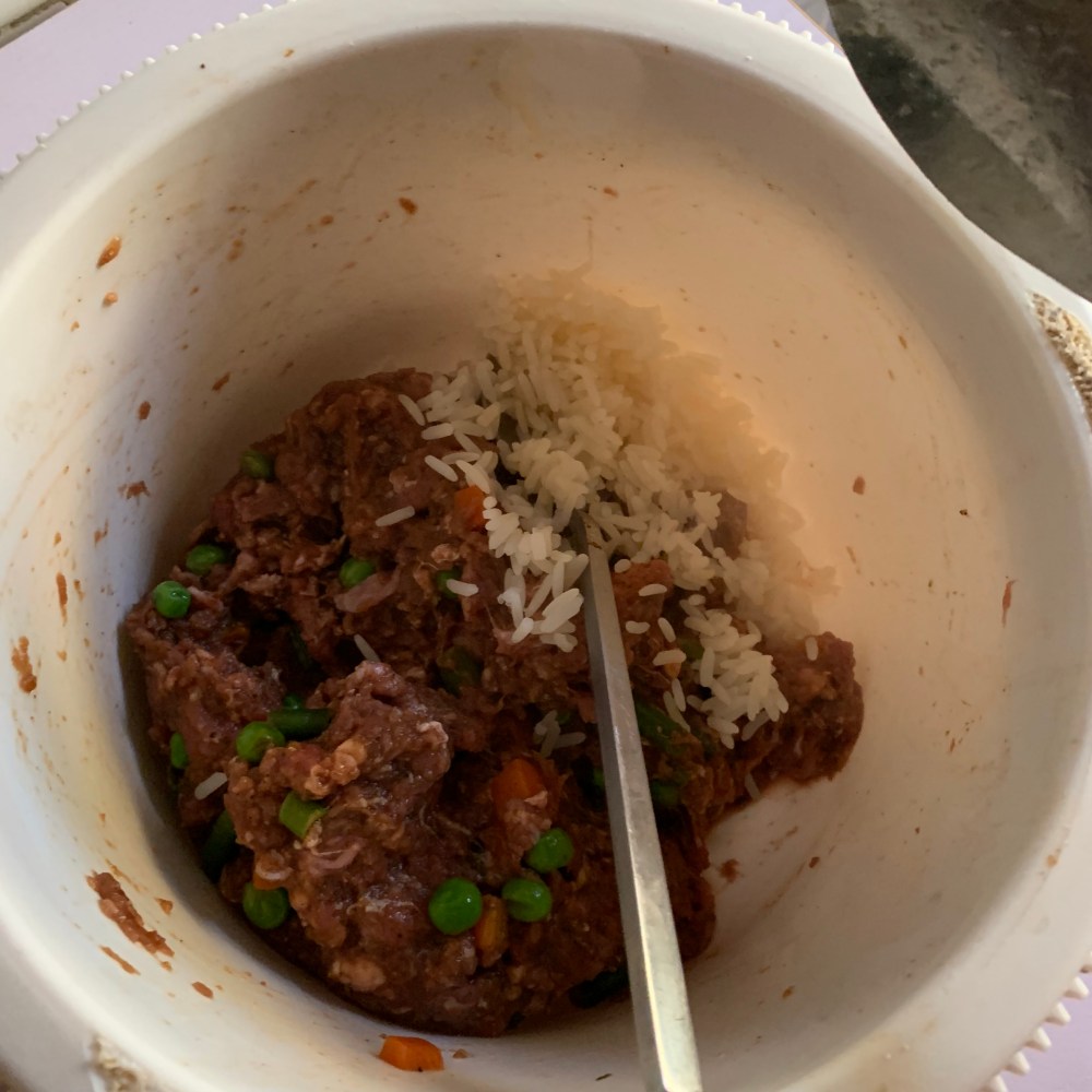 In a bowl add minced beef, spices, peas and carrots, tomato paste, seasoning, eggs and mix. Add in the cooked rice and mix again.