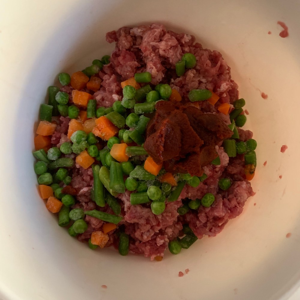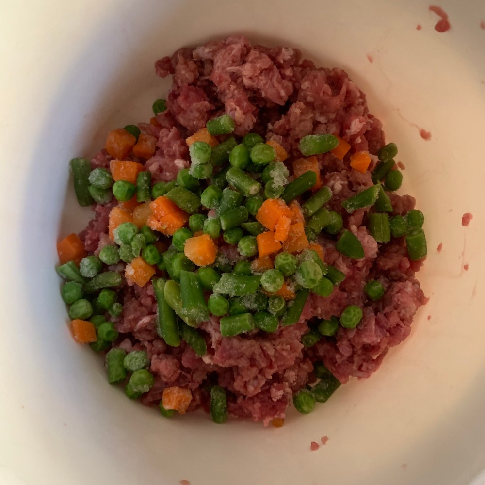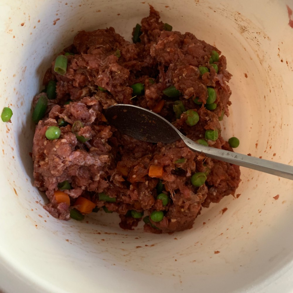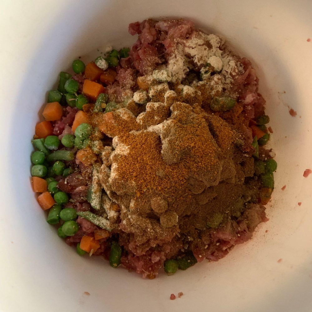 In a bowl add minced beef, spices, peas and carrots, tomato paste, seasoning, eggs and mix. Add in the cooked rice and mix again.